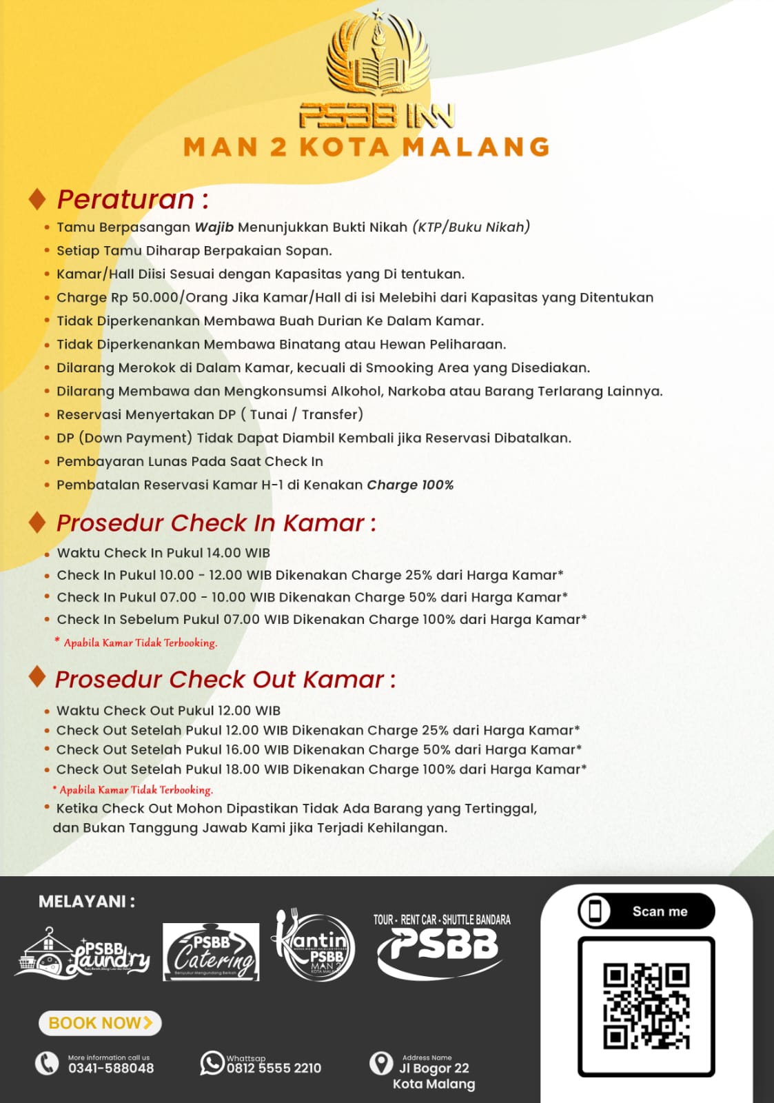 Berada di Tengah Kota Malang PSBB INN MAN 2 KOTA MALANG berdekatan dengan kampus UM, UB, UIN MALIKI, UMM kampus 1 dan hanya beberapa menit dari Matos, Transmart, MOG dan pusat kota Malang.